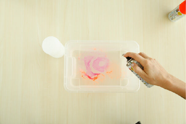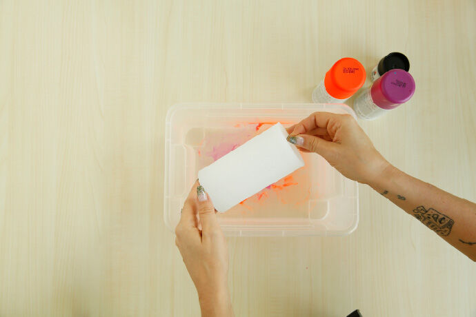 Remplissez un bac d’eau. Pulvérisez prudemment de la peinture sur la surface de l’eau. Formez plusieurs couches jusqu’à obtenir le résultat souhaité. Essayez de travailler rapidement car plus vous attendez, plus la peinture sèche et moins il est facile de peindre la bougie.