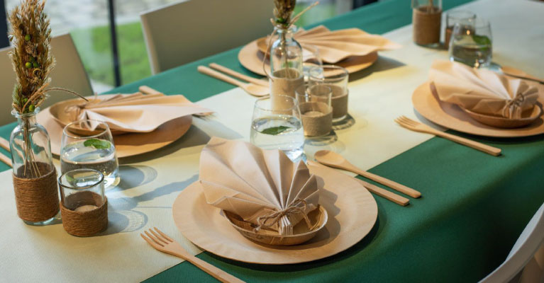 Idée déco : un saladier en matériau naturel ajoute une touche rustique à votre décoration de table. Et pour parfaire l’ensemble avec fraîcheur et délicatesse, déposez quelques brins de verdure, comme de la menthe fraîche ou de l'eucalyptus.