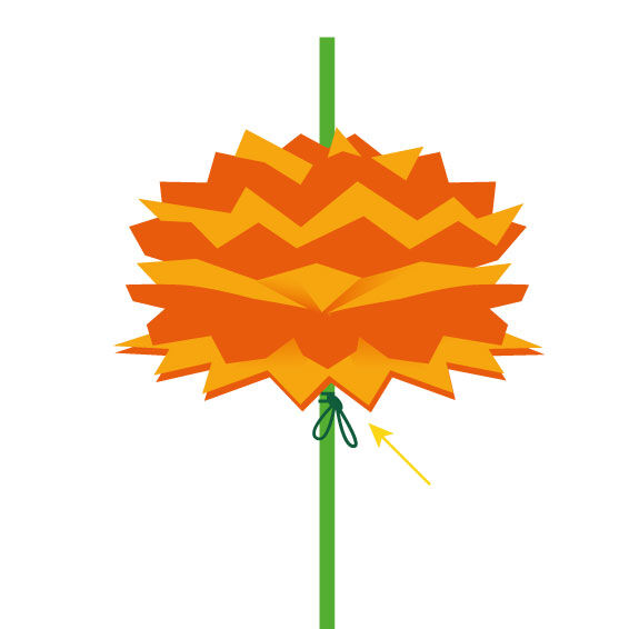 Agrafez les 2 côtés du papier de fleuriste solide et piquez le bâton dans le centre de la fleur. Veillez à ce qu'un morceau du bâton reste visible au-dessus de la fleur.
