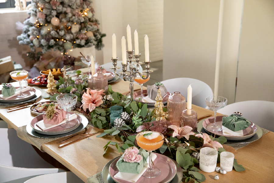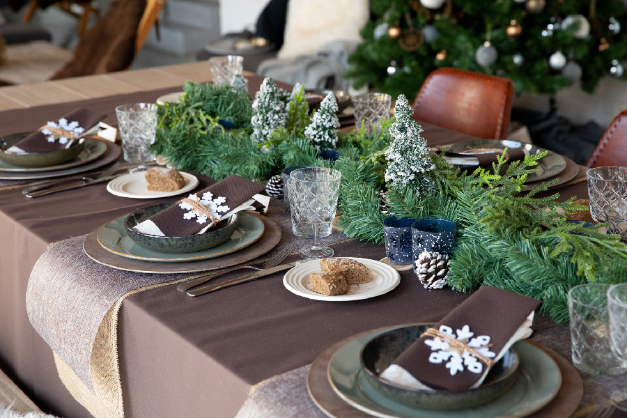 Les assiettes profondes avec un motif Starry Night et les assiettes noires et blanches sur le dessus s’intègrent parfaitement dans cette tendance de Noël, tout comme les serviettes noires pliées dans une forme abstraite. Combinez le noir et le blanc avec quelques éléments décoratifs : une fleur dorée sur les serviettes, des étoiles dorées et des bougeoirs scintillants sur la table et votre table de fête sera immédiatement plus élégante, avec une touche de mystique. Votre table de fête brillera.