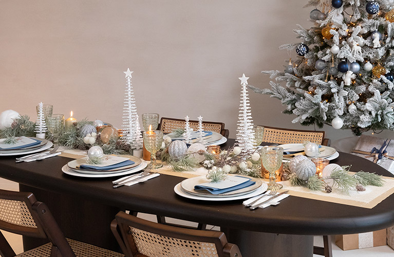Le bleu et le beige campent les rôles principaux sur la table, le tout couvert d'une fine couche de neige pour une scène hivernale féerique. Ajoutez-y encore une note argentée et vous vous croirez dans le Grand Nord.