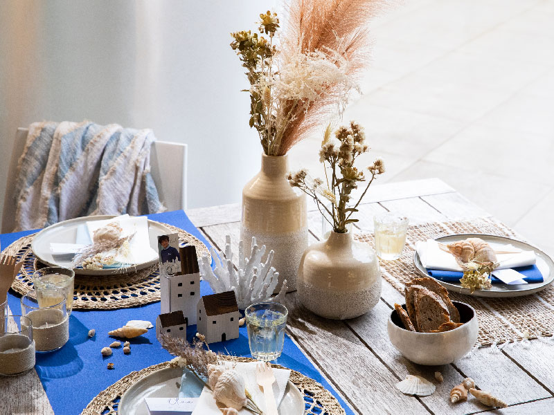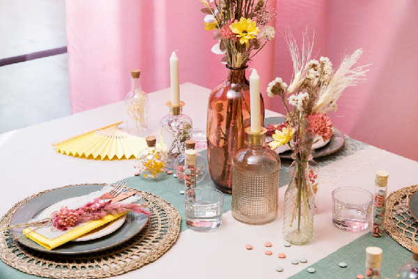 Vous égayez votre nappage blanc-rose avec des renoncules et des tulipes dans des vases aux accents d'or rosé, des bougeoirs roses transparents et des bougies blanches d'ambiance. Pour compléter l'image, placez un mini-bouquet coloré sur chaque assiette, étalez un peu de dragées confetti sur la table et choisissez quelques ballons et boules alvéolées assortis aux mêmes couleurs printanières florissantes.