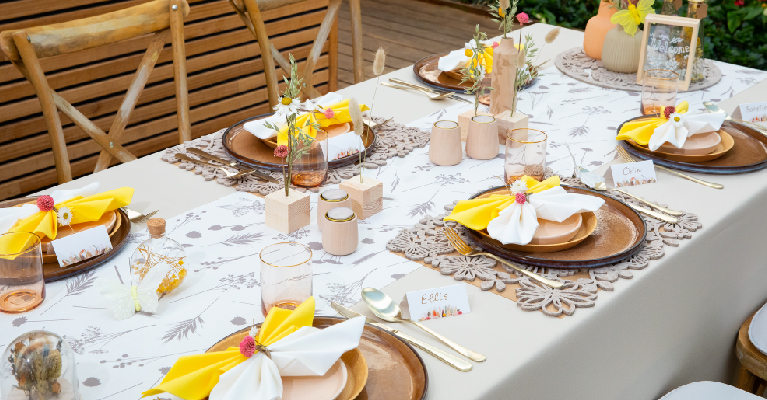 En cas de communion ou de fête laïque, décorez davantage votre table avec de jolis remerciements. En rose, bien sûr. Choisissez une savonette ou une sucette avec des paillettes couleur cuivre. Ajoutez-y une touche personnelle et attachez, à l’aide d’une ficelle, une carte nominative à votre remerciement.