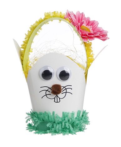 La base de ce joli lapin de Pâques est une boîte à pâtes (disponible dans tous les magasins AVA, à l'arrière, rayon horeca). Coupez, collez, dessinez… et vous obtenez un panier pratique en quelques instants.