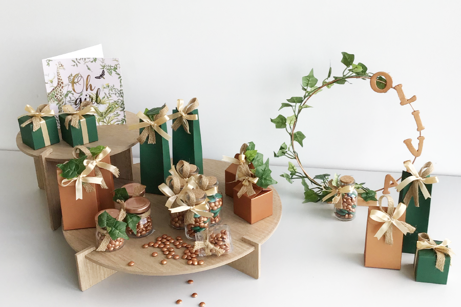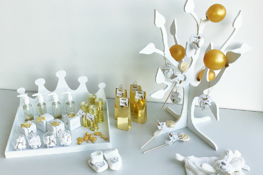 Verwelkom je baby met deze rosé golden combinatie. De witte doosjes en zakjes zorgen voor een frisse uitstraling tussen het blinkend rosé gold van de zakjes en bellenblazers.