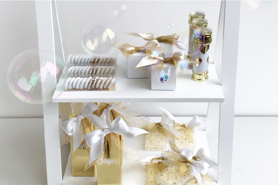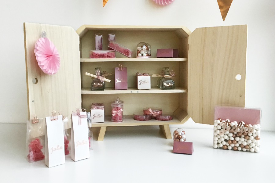 Om je suikerbonen te verpakken, kies je voornamelijk uit geschenkdoosjes in verschillende vormen: kubusvormig, langwerpig en rechthoekig of bolle envelopjes in een mix van wit, donkergroen en glanzend zilver. Je maakt ze helemaal af met een naamsticker, een metalen clip of een sleutelhanger met een minivogel.