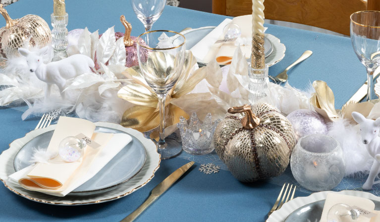 Een kersttafel in Boho stijl, die is bekleed in wit, beige en een vleugje goud. In het midden van de tafel stelen besneeuwde wintertakken, kerstballen, theelichtjes en kaarsen de show. Ho ho ho, daar is Boho!