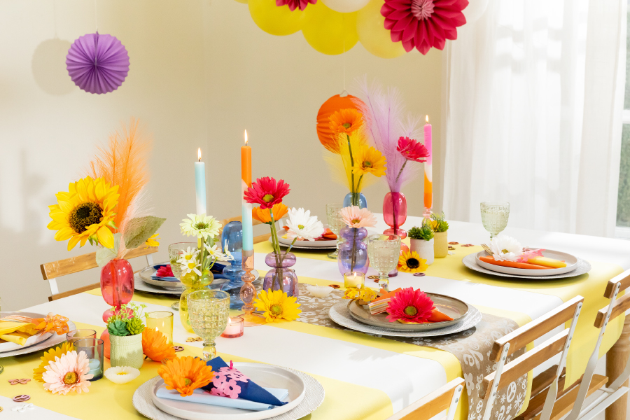 Een witte tafelrol en een juten tafelloper bovenop de witblauwe loper vormen de basis van deze tafel. Met een gaasdoek gedrapeerd over de hele breedte creƫer je extra gezelligheid. Vul verder aan met vazen in dezelfde tinten en plaats ook een paar plantjes om het geheel te doorbreken.