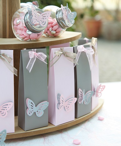 Elke suikerboonverpakking werd afgewerkt met een strikje in de contrasterende kleur en een geponste vlinder.