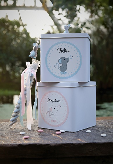 - De stickers op de tinnendoos en de platte pastille doosjes werden besteld aan de AVA info balie met ineens de naam van de baby erbij.