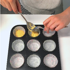 Vul de bakpapiertjes met het deeg. Tip: vul ze tot 2/3 zodat de cupcakes niet boven de rand uitsteken. Dat is beter om te decoreren. Haal de cupcakes uit de oven en laat ze even afkoelen.